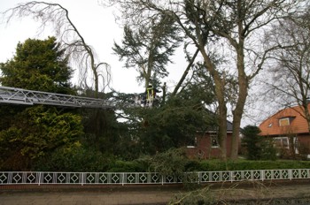 Den Anfang machte ein dicker Ast, der in der Straße An der Welle drohte, auf die Straße zu stürzen. Der Rest des Baumes musste aus Sicherheitsgründen ebenfalls entfernt werden. Dieser Einsatz wurde durch ein Löschgruppenfahrzeug und die Drehleiter abgearbeitet.