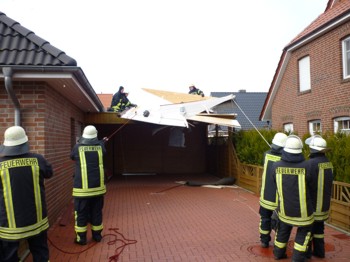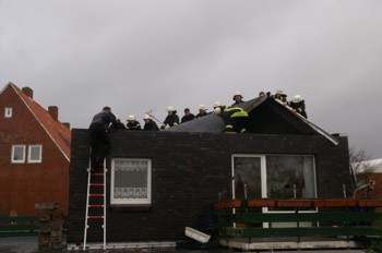 Zwei weitere Löschgruppenfahrzeuge mussten dann nach Süderneuland in die Straße Siedland. Dort hatte sich das Dach eines Holzgartenhauses gelöst und war auf ein Carport des Nachbargrundstücks geweht. Die Einsatzkräfte sicherten das Dach.