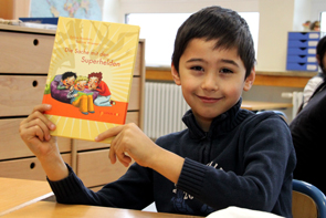 Die Kinder der 1b sind begeistert. Entweder finden sie „Till Eulenspiegel“, den „Zauberer von Oz“ oder das Buch „Die Sache mit den Superhelden“ in ihrem Beutel. Später sollen die Bücher getauscht und verliehen werden. Franz freut sich über die „Superhelden“ und liest seiner Mitschülerin Lisa direkt mal ein paar Zeilen vor. Mert ist besonders fasziniert, dass er bald in seiner Suppe lesen kann. Buchstaben-Nudeln sind eine ganz neue Entdeckung für den Sechsjährigen.