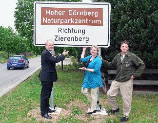 Mehr Werbung für das Naturparkzentrum Dörnberg Region Kassel. Ab sofort weisen insgesamt zehn touristische Hinweisschilder an Bundes- und Landesstraßen rund um den Dörnberg auf das Naturparkzentrum des Zweckverbandes Naturpark Habichtswald auf dem Hohen Dörnberg hin. „Auch für das Naturparkzentrum gilt: Tue Gutes und weise darauf hin“, betont Vizelandrätin Susanne Selbert bei der Vorstellung der Hinweisschilder. Sowohl in der Region wie auch für Besucher von außerhalb, seien die braunen touristischen Hinweisschilder eine gute Orientierungsmöglichkeit, die auch in Zeiten von Navigationsgeräten gute Dienste leisten. „Die Hinweisschilder sind hervorragende Werbeträger – diese Erfahrung haben wir beim Tierpark Sababurg bereits gemacht„, so Selbert weiter. Möglich wurde die Realisierung der Beschilderung durch eine finanzielle Unterstützung der Kasseler Sparkasse in Höhe von 7.000 Euro. „Wir haben uns hier gern engagiert, da wir touristische Initiativen in unserer Region unterstützen“, erläutert Wolfram Ebert, Vorstandsmitglied der Kasseler Sparkasse. Die Aufstellung der Hinweisschilder benötigte einen längeren Vorlauf. „Für die Aufstellung war neben der Genehmigung der Straßenverkehrsbehörde eine Standortbegehung mit Hessen Mobil erforderlich, bei der die genauen Aufstellorte und die Art der Befestigung festgelegt wurden“, informiert Jürgen Depenbrock, Geschäftsführer des Zweckverbandes Naturpark Habichtswald. Nachdem dann die Kosten und die Finanzierung feststanden, musste noch das richtige Wetter für die Schilderaufstellung abgewartet werden. Da dies nur bei dauerhaft wärmeren Temperaturen möglich ist, konnten die Schilder erst in dieser Woche aufgestellt werden.