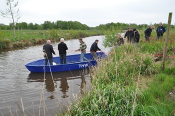 Nach dem kurzen Vortrag zu der Planung und der Realisierung der Baumaßnahme, begaben sich die Teilnehmer auf einen Rundgang über das Gelände. Hierbei setzten Mitglieder des THW die Besucher auch mit einem Boot über einen Seitenarm des Galgentiefs, um Anpflanzungen auf der Ausgleichsfläche auf der gegenüberliegenden Uferseite zu besichtigen.