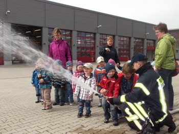 Die Kindern sahen sich die Fahrzeuge an, durften mal Probe sitzen und einen echten Feuerwehrhelm aufsetzen. Anschließend gab es noch eine Fahrt in einem Feuerwehrauto und es durfte mit einem richtigen Feuerwehrschlauch gespritzt werden. Text: U. Bents, Bilder: S. Reese