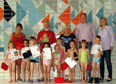 Schwimmen macht stark und fit! Sümmeraner Kita-Kinder erlangten Seepferdchen Seit vielen Jahren besuchen die Kinder der städtischen Kindertagesstätte Sümmern regelmäßig das Lehrschwimmbecken der Hauptschule Hennen zur Wassergewöhnung. Ab dem vierten Lebensjahr erlernen die Kleinen dort unter der Leitung des Schwimmpädagogen Harald Schnepper und zweier Erzieherinnen spielerisch die Grundfertigkeiten Tauchen, Springen, Gleiten und Atmen. Richtig schwimmen können sie aber noch nicht. Um dies zu ändern, hat das Team der Kita Sümmern gern den Vorschlag der Ersten Beigeordneten und Ressortleiterin Generationen und Bildung der Stadt Iserlohn, Katrin Brenner, aufgegriffen, sich am Projekt "Seepferdchen in der Kita" zu beteiligen. Das Projekt, das im Herbst letzten Jahres aufgrund eines Antrages der CDU-Fraktion vom Jugendhilfe- und vom Sportausschuss der Stadt Iserlohn beraten und unterstützt worden war, hat das Ziel, möglichst vielen der rund achthundert Iserlohner Kinder im Kindergartenalter das Schwimmen beizubringen und in von der Stadt finanzierten Kursen das Seepferdchen zu ermöglichen. An dreizehn Nachmittagen haben die Kinder der Kita Sümmern neben viel Spaß im und am Wasser alle Fähigkeiten erworben, die sie zu diesem Schwimmabzeichen benötigen. Die regelmäßigen Fahrten nach Hennen wurden von den Eltern gern durch Fahrgemeinschaften organisiert.