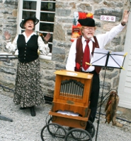 Schaurig-schöne Leierkastenmusik: Das Duo „Fätz Pätz“ spielt und singt zum Naturparktag seine Moriate am Schloss-Seeufer der Tüschenbroicher Mühle.