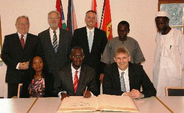 Botschafter Mamour A. Jagne und seine Ehefrau mit Landrat Michael Makiolla beim Eintrag in das Goldene Buch des Kreises auf Haus Opherdicke. Mit dabei: Kreisdirektor Rainer Stratmann, Jürgen Poller (GEKO e.V.), Peter Gördeler (Ev. Krankenhaus Unna) und die Krankenpfleger Ousman Jammeh und Sillaba Drammeh (stehend v.l.). Foto: Kreis Unna