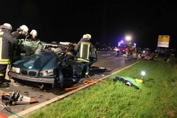 Der Golf schleuderte in einen Straßengraben. Der BMW kam nach einigen Metern auf der Straße zum Stillstand. In dem Golf saßen zwei Männer sowie eine Frau. Der Mitfahrer auf der Rücksitzbank wurde durch den heftigen Aufprall und einen Überschlag durch eine Seitenscheibe aus dem Wagen herausgeschleudert. Er und der Fahrer erlitten schwerste Verletzungen. Die Beifahrerin kam mit leichten Verletzungen davon. Auch der Fahrer des BMW wurde schwer verletzt und in seinem Wrack eingeklemmt.