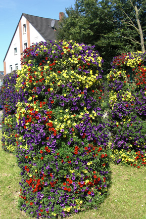 Der bunte Blumenschmuck befindet sich an mehreren Orten in Herten: aufmerksame Bürger werden ihn schon am Ortseingang Kaiserstraße/Akkoallee, an der Kreuzung Kaiserstraße/Feldstraße/Schützenstraße, in den Grünflächen Breite Straße/Hertener Straße und Westerholter Straße/Hertener Straße sowie an der Kranzplatte in Langenbochum entdeckt haben.