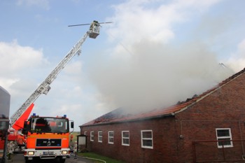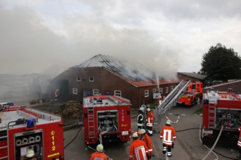 Als die örtlichen Wehren den Terhaller Weg erreichten, stand der Stall bereits in Vollbrand und der Totalverlust war eingetreten. Da das Gebäude einzustürzen drohte und die Flammen benachbarte Gebäude gefährdeten, wurden umgehend aus Norden die Drehleiter und der Schlauchwagen nachalarmiert.