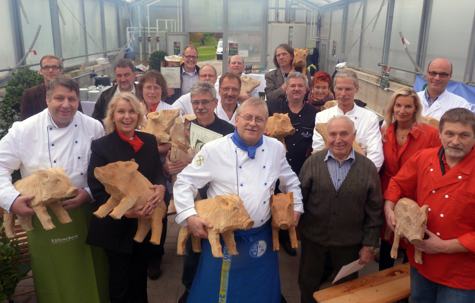 Eine genussvolle Werbung für die Region: Das Habichtswaldschwein Region Kassel. Liebe geht bekanntlich durch den Magen. Die Liebe zum Habichtswald soll wieder ab dem 6. Oktober 2012 für drei Wochen in 20 teilnehmenden Restaurants im Habichtswald durch spezielle Wildschweingerichte befriedigt werden. „Nach dem Erfolg der ersten „wilden Wochen“ des vergangenen Jahres starten wir jetzt die zweite Auflage und damit hoffentlich eine neue Tradition“, erläutert Sabine Schwarzer von der Touristischen Arbeitsgemeinschaft (TAG) Habichtswald, die das Projekt zusammen mit dem Zweckverband Naturpark Habichtswald, der GrimmHeimatNordHessen, dem Kreisverband des Deutschen Hotel- und Gaststättenverbandes, dem Landesbetrieb Hessen-Forst und den Kreisjagdvereinen organisiert hat. Wild aus dem Habichtswald sei ein „einzigartiges, hochwertiges und unbelastetes“ Bioprodukt, ergänzt Jakob Gruber vom Zweckverband Naturpark Habichtswald. Die Entscheidung auf Schwarzwild zu setzen, sei richtig, da das „Habichtswaldschwein das Zeug zu einer Marketing-Ikone hat“, so Gruber weiter. „Vorteil für unsere Planung ist, dass man mit Wildschweinfleisch ausgesprochen vielfältige Gerichte anbieten kann und das Fleisch ganzjährig zur Verfügung steht“, ergänzt Stefan Frankfurth, Chef des Parkhotels Emstaler Höhe in Bad Emstal. Das Fleisch des Habichtswaldschweins sei dunkelrot, aromatisch und saftig. Frankfurth: „Es lässt sich hervorragend marinieren, es kann gebraten, geschmort oder gegrillt werden und für aromatischen Schinken, für deftige Wurst und delikate Sülzen kann man es auch sehr gut nutzen“. „Mit dem Habichtswaldschwein schaffen wir ein geschmackvolles und absolut authentisches Alleinstellungsmerkmal“, betont Sabine Schwarzer von der TAG Habichtswald. Sie sei sicher, dass dadurch die Region entscheidend bereichert und dass Interesse von Touristen geweckt wird. Die teilnehmenden renommierten Gastronomiebetriebe aus Bad Emstal, Breuna, Edermünde, Gudensberg, Kassel, Naumburg, Schauenburg, Wolfhagen und Zierenberg erhalten ein mit einer Motorsäge hergestelltes Holzwildschwein. „Damit kann der Gast sofort erkennen, dass es sich hier um einen Betrieb handelt, der sich um besondere Angebote rund um das Habichtswaldschwein kümmert“, informiert Naturpark-Mitarbeiter Gruber. Dass zu den 17 Betrieben aus dem Startjahr jetzt noch drei hinzugekommen sind, sei ein „toller Erfolg“. Außerdem sind noch drei Metzgereien neu mit im Boot, die Wildschweinprodukte für das „Kochen zu Hause“ anbieten. Der Naturpark Habichtswald versuche mit solchen Gemeinschaftsprojekten die Menschen in der Region auf die faszinierende Landschaft des Habichtswalds, seine Kultur und Geschichte aufmerksam zu machen. Gruber: „Das ist eine der ganz wesentlichen Naturparkaufgaben“. Die „Wilden Wochen“ im Habichtswald laufen vom 6. Oktober bis 28. Oktober 2012. Jedes Restaurant bietet in dieser Zeit mindestens drei verschiedene Wildschweingerichte an. Einzelne Restaurants haben ein dreigängiges Menü im Angebot, bei dem alle Gänge vom Habichtswaldschwein stammen. Pressekontakt: Pressestelle LANDKREIS KASSEL, Harald Kühlborn Zu dieser Meldung können wir Ihnen folgendes Medium anbieten: Habichtswaldschwein 003 Auf dem Foto sieht man die Vertreter der teilnehmenden Betriebe mit dem Habichtswaldschwein im Arm.