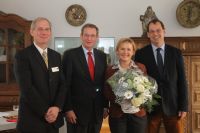 Naturpark-Verbandsvorsteher Peter Ottmann (2.v.l.) und Verbandsversammlungs-Sprecher Dr. Ferdinand Schmitz (r.) verabschieden auf der Versammlung im Niederrheinischen Freilichtmuseum die scheidende Geschäftsführerin Schwalm-Nette, Christa Eicher, und stellen den Nachfolger Michael Puschmann vor. Foto: Axel Küppers / Abdruck honorarfrei