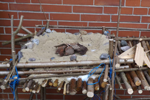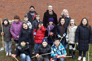 Von der Planung, bis zur Herstellung der Bauteile und der anschließenden Montage mithilfe einer besonderen Knotentechnik waren die Kinder von Anfang an die „Macher“. Aus selbst gesägtem Haselnussholz, Natursteinen und Sand bauten sie in zwei Gruppen ihren eigenen Steinzeitgrill. Immer wieder wurden die Knoten geprüft und die Verbindungen ausgebessert, bis tatsächlich auf der soliden Kochmulde ein vorweihnachtlicher Schmaus zubereitet werden konnten. Auf der Speisekarte standen Stockbrot und Kinderpunsch! Ein toller Spaß für alle Wildnisköche der beiden Grundschulen.