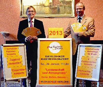 Vorstellung des Veranstaltungsprogramms 2013 der Musikschule Iserlohn "Das war schon ein tolles, ereignisreiches Jahr mit dem Musikschul-Jubiläum", so Bürgermeister Dr. Peter Paul Ahrens rückblickend auf 2012, "und die gemeinsame Leistung aller Musikschüler und -lehrer war großartig!". Dass für 2013 erst einmal wieder ein "ganz gewöhnliches" Programm geplant ist, sei verständlich, obwohl der Blick ins neue Jahr eine beeindruckende Fülle von Konzerten und anderen musikalischen Ereignissen zeige. Zusammen mit Musikdirektor Paul Breidenstein stellte er jetzt das druckfrische Veranstaltungsprogramm 2013 der Musikschule Iserlohn vor, das mit dem beliebten Wettbewerb "Jugend musiziert" beginnt und mit Ensemblekonzerten von Big Band und Sinfonieorchester, Tag der offenen Tür und Weihnachtsmusiken die traditionellen Schwerpunkte auflistet. Sieben Iserlohner Kammerkonzerte präsentieren Gastkünstler ebenso wie eigene Lehrkräfte der Musikschule, die neben der Unterrichtstätigkeit ihre virtuosen Fähigkeiten in abwechslungsreicher Folge unter Beweis stellen. So eröffnet gleich am 20. Januar der Pianist und Klavierlehrer Andreas Hering die Konzertreihe in der Gartenstraße mit "Leidenschaft und Atmosphäre" am großen Bösendorfer Imperial Flügel, und am 24. Februar konzertiert Martin Schröder (Trompete) im "Kammerkonzert auswärts" in der Obersten Stadtkirche. Hornlehrer Adrian Ebmeyer spielt mit Andreas Hering und Musizierpartnern "Klassische Quartette in der Villa" (13. März) und Klarinettenlehrer Roland Kirch lädt mit Klavierlehrer Eugen Momot zu "Klezmer meets Swing" in die Musikschule (23. Juni) ein. In Gastkonzerten stellt sich der gefragte Konzertklarinettist Michael Wolf mit Werken "Im Schatten von Brahms" vor (22. September) und der Freundeskreis der Musikschule ermöglicht ein Sonderkonzert des Trio Bamberg aus New York und Moskau, das schon vor Jahren in Iserlohn das Publikum begeisterte (10. November). Das Veranstaltungsprogramm liegt in der Musikschule in Iserlohn (Gartenstraße 39) und in der Zweigstelle Letmathe (Oeger Straße 9) sowie im Rathaus am Schillerplatz und in der Sparkasse aus und steht im Internet unter www.musikschule.iserlohn.de als pdf-Datei zum Download bereit. |