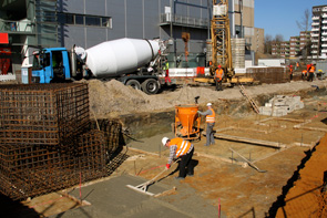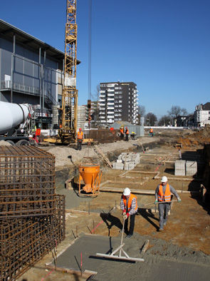 „Die Sauberkeitsschicht, die wir in dieser Woche fertigen, stellt die Grundlage für das Fundament dar“, erklärt Michael Franke von der Firma Eurovia. Auf die ungefähr zehn Zentimeter dicken Betonschichten werden Metallkörbe aus Baustahl zur Bewehrung der Fundamente gesetzt. Im Anschluss wird hierum jeweils eine Schalung aufgebaut und mit Beton ausgegossen. Diese circa 1,50 mal 2 Meter großen Fundamente bilden später die Grundlage für die Dachverankerung des neuen ZOBs. wird. Voraussetzung für diesen nächsten Schritt sind allerdings Temperaturen von über fünf Grad: „Das sieht aber bislang ganz gut aus!“, hofft Michael Franke.