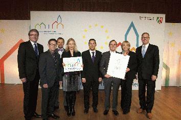 Die Stadt Iserlohn ist Europaaktive Kommune! Die Stadt Iserlohn hat am 12. April von Ministerpräsidentin Hannelore Kraft die Auszeichnung "Europaaktive Kommune in Nordrhein-Westfalen" erhalten. Bürgermeister Dr. Peter Paul Ahrens nahm die Urkunde und die Plakette mit dem Logo bei einer Feierstunde im Düsseldorfer Museum Kunstpalast entgegen. Begleitet wurde er von Matthias Quaschnik und Katja Michalski vom Büro für Europaangelegenheiten sowie von Frank Finkeldei vom Ressortreferat Generationen und Bildung, der gleich in mehrere Europaprojekte der Stadt Iserlohn involviert ist. Die Auszeichnung wurde gemeinsam von der Ministerin für Bundesangelegenheiten, Europa und Medien, der Regionalen Vertretung der Europäischen Kommission in Bonn und der Bertelsmann Stiftung entwickelt und dieses Jahr zum ersten Mal an 25 Städte und Kreise vergeben. Ministerpräsidentin Hannelore Kraft würdigte die Europaarbeit der ausgezeichneten Kommunen: "Die 25 Städte und Gemeinden zeichnen sich durch ihr besonderes kommunales Europa-Engagement aus. Mich hat beeindruckt, wie praxisnah und alltagstauglich der europäische Gedanke in diesen Kommunen gelebt wird." Die Stadt Iserlohn stellte im Bewerbungsverfahren ihre Europaaktivitäten der letzten fünf Jahre dar. Dies beinhaltete unter anderem die Durchführung zahlreicher Europaprojekte, an denen meistens auch die Partnerstädte beteiligt waren, die Unterstützung städtepartnerschaftlicher Begegnungen, die Bildung von Netzwerken zu verschiedenen Partnern sowie anderen Europaakteuren und die Information und Beratung der Einwohner. Auch die vielen Aktivitäten der ehrenamtlichen Städtepartnerschaftskomitees wurden hervorgehoben. Die Jury, die über die Auswahl der "Europaaktiven Kommunen" entschied, setzte sich zusammen aus Vertretern der Landesregierung, der Vertretung der Europäischen Kommission in Bonn, der kommunalen Spitzenverbände und des Deutschen Instituts für Urbanistik. Neben der Auszeichnung wurden auch Sonderpreise in sechs Kategorien vergeben. Weitere Informationen finden Interessierte online unter www.europaaktivekommune.nrw.de. |