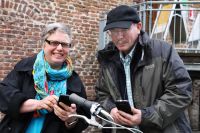 Landschaftsarchitektin Martina Hoff und Karl-Wilhelm Kolb vom Naturpark Schwalm-Nette nehmen ab der Burg Brüggen die GPS-gestützte Wasser.Blick-Radtour in Angriff. Foto: Axel Küppers / Abdruck honorarfrei