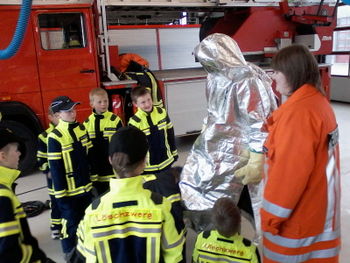 Dass so ein Löschfahrzeug nicht nur Geräte zum Löschen hat wurde den Löschzwergen anschaulich gezeigt. So wird das Fahrzeug oft bei Hilfeleistungen eingesetzt. Eine Schnittschutzausrüstung gehört genauso zur Beladung wie ein Hitzeschutzanzug. Beide Anzüge wurden dann noch von den Löschzwergen genauer unter die Lupe genommen. Ein Betreuer zog sich die Ausrüstung vor den Augen der Kinder an, dabei unterstützen sie durch Anreichen der einzelnen Kleidungsstücke.