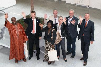 Bildzeile: Die gambischen Krankenpfleger Anna Jatta und Mafu Ceesay mit Kreisdirektor Dr. Thomas Wilk (2.v.l.), Peter Goerdeler vom Evangelischen Krankenhaus Unna (r.), Gerhard Pielken vom Fachbereich Kultur sowie Ruth Walentowski und Jürgen Poller (2.v.r.) von GEKO. Foto: Kreis Unna