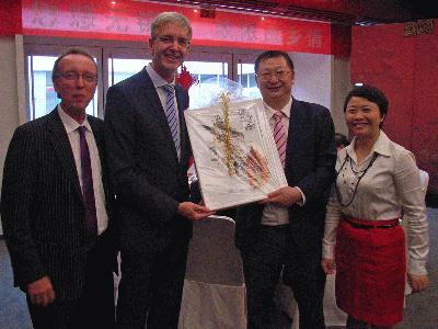 Stadtbaurat Ulrich Paßlick überreicht dem Präsidenten des Handelsbüros Robert Cao ein Bild des Historischen Rathaus (v.l.n.r.: Dr. Otmar Becker, nrw.invest, Ulrich Paßlick, Robert Cao, Carol Yuan, DCC) - Foto: Udo Tekampe, DCG Bocholt