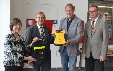 Ab sofort Defibrillator im Stadtbahnhof Ab sofort gibt es auch im Stadtbahnhof Iserlohn einen Defibrillator. Der Rotary Club Iserlohn hat diesen im Rahmen seines Defibrillator-Projektes gesponsert. Dr. Joachim Köhne und Jörg Baehrens übergaben das Gerät in dieser Woche an Bürgermeister Dr. Peter Paul Ahrens und VHS-Leiterin Liselotte Berthold. Der Defibrillator wurde in der Kundenhalle des Stadtbahnhofes angebracht, sodass Mitarbeiter und Besucher der Volkshochschule, Kunden der im Stadtbahnhof ansässigen Geschäfte und alle, die sich im und um das Gebäude herum aufhalten, es im Notfall schnell erreichen können. In Zusammenarbeit mit dem Deutschen Roten Kreuz findet eine Schulung für die Mitarbeiter der Volkshochschule und der Bahnhof-Geschäfte zum Umgang mit dem Gerät statt. Wie VHS-Leiterin Liselotte Berthold mitteilt, sollen alle im Gebäude ansässigen Mieter angesprochen und zur Schulung eingeladen werden. Insgesamt wurden bislang 25 Iserlohner Einrichtungen vom Rotary Club Iserlohn mit Defibrillatoren ausgestattet. |