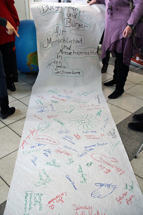 Ein besonderes Projekt startete außerdem das Bündnis für Demokratie. Die Mitglieder haben sich vorgenommen, einen solidarischen Gruß nach Schneeberg zu schicken. Hertens Partnerstadt stand zuletzt wegen rechtsextremer Demonstrationen gegen eine Asylunterkunft in der Öffentlichkeit. Als Zeichen gegen Fremdenfeindlichkeit und für Toleranz schickt das Bündnis ein Plakat mit der Aufschrift „Bürgerinnen und Bürger für Menschlichkeit und Menschenrechte in Herten und in Schneeberg“ und zahlreichen gesammelten Unterschriften nach Schneeberg.