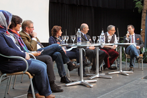 Eine Podiumsdiskussion beendete die Veranstaltung im Glashaus. Claudia Walther (Bertelsmann-Stiftung), Bekir Uzunoglu (Integrationsratsvorsitzender), Matthias Müller (Geschäftsführer Caritasverband Herten e. V.), Sengül Mizac (Mitglied Integrationsrat), Dirk Sopka (Fachbereichsleiter Familie, Jugend und Soziales) und Hasan Yavas (2. Vorsitzender des Integrationsrats) diskutierten über die Weiterentwicklung der Willkommenskultur in Herten. Dabei beantworteten sie die Frage, was Willkommenskultur für sie persönlich bedeute. Sengül Mizac äußerte hier einen Wunsch an die städtischen Behörden: „Ich wünsche mir ein respektvolles Miteinander und dass alle auf Augenhöhe bleiben.“