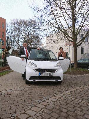 Kreisverwaltung macht E-mobil – erstes Elektrofahrzeug im Fuhrpark Region Kassel. Die Kreisverwaltung macht E-mobil – ein Smart wird das erste Elektrofahrzeug im Fuhrpark des Landkreises. „Wir haben uns nach intensiven Prüfungen der wirtschaftlichen und organisatorischen Rahmenbedingungen für den Einsatz des Elektrofahrzeugs für das Gesundheitsamt Region Kassel entschieden“, informiert Landrat Uwe Schmidt bei der Übergabe des neuen „Kreisstromers“ an Dr.Karin Müller, die Leiterin des gemeinsam von Stadt und Landkreis getragenen Gesundheitsamtes.