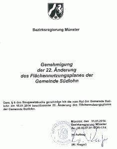 Am 05.02.2014 ist das Amtsblatt 2/2014 der Gemeinde Südlohn erschienen. Von besonderer Bedeutung für den Ortsteil Oeding ist hier die Bekanntmachung der Genehmigung der Flächennutzungsplanänderung für das Baugebiet Burlo-West. Die Bezirksregierung Münster hat hier mit Schreiben vom 31.01.2014 die notwendige Genehmigung zum Ratsbeschluss erteilt.