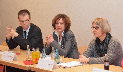 Bildinfo: Viel Lob gab es für die Umsetzung eines wegweisenden Schmerztherapiekonzeptes im Klinikum Westfalen von den Visitorinnen Dr. Susanne Stehr-Zimgibl (Mitte) und Ulrike Schmid. Links im Bild: Schmerzmediziner Dr. Thomas Hofmann.