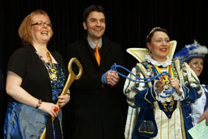 Moderatorin Conny Meyer begrüßte in frecher pinker Perücke zahlreiche feierwütige Bürgerinnen und Bürger in der Rotunde. Schließlich entlockte sie Dr. Uli Paetzel das Versprechen, ein Fass Bier zu spendieren. „Auf dass wir heute Nachmittag alle viel Spaß zusammen haben“, rief dieser von der Bühne aus in die jubelnde Menge. Kurz darauf befreite ihn das Gefolge der jecken Prinzessin dann auch von seinen Fesseln. Trotz Entführung bescheinigte eine unter den Gästen anwesende Krankenschwester dem Bürgermeister beste Gesundheit.