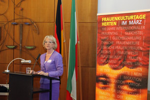Als Mitstreiterin aus den Anfängen der Gleichstellungspolitik in Herten zeigte sich Jutta Haug stolz über die Entwicklung, die die Hertener Frauenkulturtage genommen haben. Dies dürfe allerdings nicht darüber hinwegtäuschen, dass es noch viel zu tun gebe. Zwar seien die Anteile von Frauen in einigen Bereichen in den letzten Jahren leicht gestiegen, doch noch immer seien Frauen in Wirtschaft, Wissenschaft und Politik stark unterrepräsentiert. Angesichts der Tatsache, dass Frauen in der Bildung mittlerweile weit vorne liegen, sei dies inakzeptabel und deshalb die Frauenquote in Vorständen und Aufsichtsräten unumgänglich. Außerdem verwies sie auf das noch immer immense Gehaltsgefälle zwischen Mann und Frau und unterstrich damit die Wichtigkeit des „Equal Pay Days“. An diesem Tag der Gleichbezahlung von Frauen und Männern wird am 21. März nachmittags auf dem Zukunftsstandort Ewald eine überregionale Aktion stattfinden.