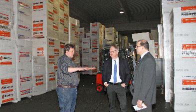 Markus Lachenit, Leiter Produktion und Technik, führte Landrat Süberkrüb und Peter Haumann, Wirtschaftsförderung Kreis Recklinghausen, durch die Produktionshallen und erläuterte die verschiedenen Produktionsabläufe. Aus kleinen Styropor-Kügelchen werden hier Styropor-Blöcke hergestellt, in die richtige Form geschnitten und verpackt. Mit dem Endprodukt werden beispielsweise Häuser gedämmt.