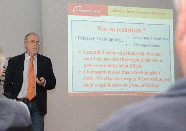 „In Deutschland sterben jährlich 26.000 Menschen an Darmkrebs. Ungefähr 6 % der Bevölkerung oder in etwa jeder zwölfte Bundesbürger zählen zu den Neuerkrankten pro Jahr. Wir unterscheiden zwischen verschiedenen Risikogruppen“ informierte Walkenhorst. Die erschreckenden Zahlen könnten allerdings bedeutend gesenkt werden. „Das Risiko zu erkranken kann beispielsweise durch die vermehrte Aufnahme von Ballaststoffen, Obst und Gemüse, um fast 25% reduziert werden“, und weiter: