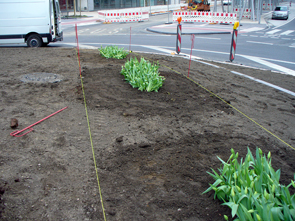 Dabei wird groß aufgefahren: 500 Quadratmeter Rollrasen, 1400 Hornveilchen, 1000 Tulpen und zwei Tupelobäume zieren in Zukunft den Kreisel. Und nicht nur das Innenauge ergrünt – auch die neuen Baumstandorte rund um den Busbahnhof erhalten eine Unterpflanzung in Form von Kirschlorbeer und Rollrasen.