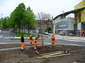Die Fahrzeuge rollen bereits durch den neuen Kreisverkehr am ZOB. Nun kümmern sich die Mitarbeiterinnen und Mitarbeiter des ZBH um die Verschönerung des bislang tristen Kreisels. Sie bepflanzen die innere Fläche, das sogenannte Innenauge. Wo bislang nur brauner Erdboden zu sehen war, wird es in den nächsten Tagen richtig grün.
