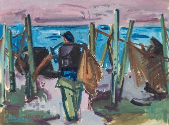 Karl Dönselmann im Sande, Mann mit Netzen, Tempera auf Papier, 1950.