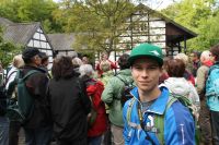 Der Kanadier Eric Schwenck mit der Wandergruppe vor Haus Wildenrath, im Hintergrund Manuel Andrack: In Kürze geht es vereint auf den Premium-Wanderweg Birgeler Urwald. Foto: Axel Küppers / Abdruck honorarfrei