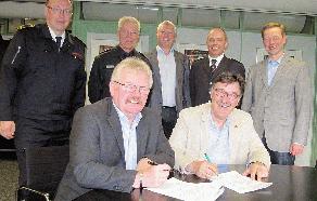 Eine entsprechende öffentlich-rechtliche Vereinbarung zwischen der Stadt Bocholt und der Stadt Rhede schlossen am Donnerstagmorgen Bürgermeister Peter Nebelo und Rhedes Bürgermeister Lothar Mittag im Beisein von Bocholts Erstem Stadtrat Thomas Waschki und Vertretern der Feuerwehren.