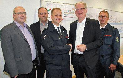 Neben Landrat Cay Süberkrüb beglückwünschten Martin Böhme, Fachdienstleiter Bevölkerungsschutz, Hans-Ulrich Seidel, Fachbereichsleiter Ordnung, Recht und Sicherheit, und Robert Gurk, Kreisbrandmeister, den neuen Leiter der Kreisleitstelle.