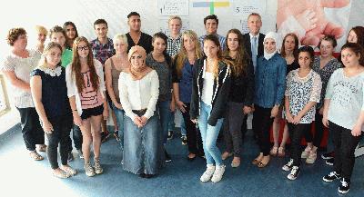 28 junge Menschen absolvieren derzeit ihre ersten Schritte in eine berufliche Zukunft am Knappschaftskrankenhaus Dortmund. Laura-Antonia Macchia und Betül Ucar werden ausgebildet zu Medizinischen Fachangestellten, Lukas Brehmer-Franke, Alissa Ehlenberger und David Rampolt zu Kaufleuten für Büromanagement. Den Beruf der Anästhesietechnischen oder Operationstechnischen Assistenten streben Elif Ersin, Cansu Evren, Johanna Wiesbrock, Pia Sundermeier, Christin Zahmel, Aliona Mavlianova, Michael Mikrut und Hilal Tatar an. 15 Jahrespraktikanten bereiten sich außerdem auf Berufe im Gesundheitswesen vor: Nieuscha Amerian, Zeynep Ceviz. Mihriban Demirdas, Fabius Nils Fuhrmann, Anabelle Götzen, Gillian Heyduk, Nenad Janevski, Nazife Kiray, Anna-Maria Lemp, Naomi Pioch, Milena Post, Flora Salihi, Hawrist Kheder Schnino, Nora Smits und Hatice Yilmaz. Zum Start begrüßten sie der kaufmännische Direktor des Klinikums Westfalen Sebastian Scheer (hinten) sowie für die Pflegedienstleitung Anja Schmitz und Heike Kötter (v.l.).