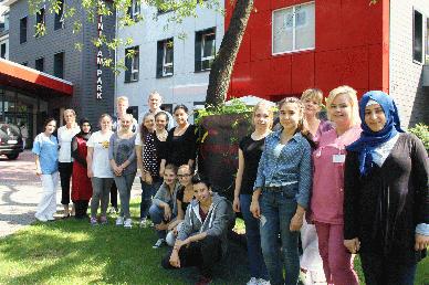 13 junge Menschen absolvieren derzeit ihre ersten Schritte in eine berufliche Zukunft an der Klinik am Park Lünen. Karina Bazova und Claudia Kreft werden ausgebildet zu Medizinischen Fachangestellten. 11 Jahrespraktikanten bereiten sich außerdem auf Berufe im Gesundheitswesen vor: Yasemin Aslan, Hanna Balzer, Vivian Brinsa, Defne Demirci, Nina Demuth (nicht im Bild), Dominik Dupke, Esther Kollek, Melissa Kopp, Rhea Ramin (nicht im Bild), Rebecca Richert und Merve Soysal. Zum Start gratulierten für die Pflegedirektion Stefanie Vollstädt (2.v.l.) und als Verwaltungsleiter Detlef Dreyer (7.v.l.).