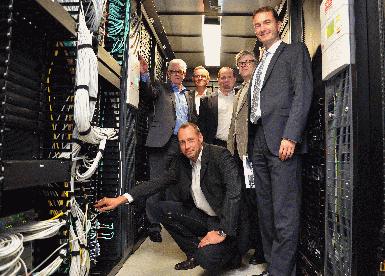 Bildzeile: Peter Decker (Zentrale Datenverarbeitung, vorn), Claus von der Höh (Prokurist ENTIREINFRA GmbH), Hans Pankalla (Leiter des Fachdienstes Zentrale Datenverarbeitung), Jan-Werner Kern (ENTIREINFRA GmbH), Hartmut Biermann (Sachgebietsleiter System- und Netzwerktechnik) und Kreisdirektor Dr. Thomas Wilk (von rechts) stellten den neuen Serverstandort vor. Foto: B. Kalle – Kreis Unna