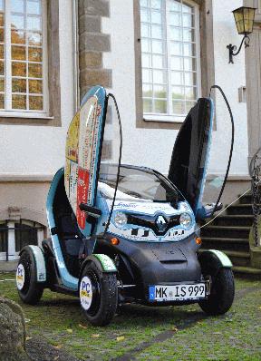 Sponsoren ermöglichen erstes städtisches E-Mobil Der erste reine Elektro-Pkw der Stadt Iserlohn ist ein durch Sponsoren finanzierter Renault TWIZY. Am Mittwoch, 17. September, übergab Bürgermeister Dr. Peter Paul Ahrens das Fahrzeug an Gerd Schäfer, Leiter der Städtischen Museen. Von nun an soll der TWIZY bei den gerade im Museumsbereich notwendigen innerstädtischen Kurzstreckenfahrten weniger umweltfreundliche Fahrzeuge zumindest teilweise ersetzen. Die Inbetriebnahme von TWIZY ist gleichsam der Startschuss für den Ausbau eines nachhaltigen elektromobilen Fuhrparks bei der Stadt Iserlohn, die sich unter anderem mit diesem Thema an dem EU-Projekt „Emobility Works“ beteiligt. Projektziel ist die Erstellung eines Elektro-Mobilitäts-Aktionsplanes und dessen Umsetzung mit lokalen Partnern. Der Einsatz von TWIZY ist daher ein deutliches Zeichen für das Bemühen, Elektromobilität im Sinne des Klimaschutzes zu forcieren. Bürgermeister Dr. Ahrens dankte bei der Fahrzeugübergabe ausdrücklich allen Sponsoren, die durch ihre auf dem Fahrzeug sichtbare Werbung dazu beitragen, das Elektromobil zu finanzieren, um damit die energie- und klimapolitischen Ziele der Stadt Iserlohn tatkräftig zu unterstützen. Neben der Werbung auf dem E-Mobil gibt ein im Rathaus-Foyer platziertes Werbebanner zusätzlich Auskunft über die zahlreichen Sponsoren, die durch TWIZY zur Förderung des Klimaschutzes in Iserlohn beitragen. |