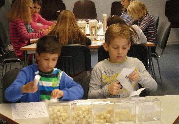 Bildzeile: Kinder aus der Leoschule Lünen lernen an der „Zuckerstation“ des Zahnärztlichen Dienstes. Foto: Dr. C. Hollinger - Kreis Unna