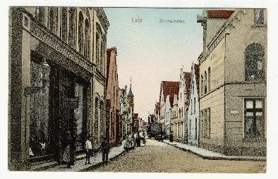 Abbildung mit dem ersten Bethaus (Speicherhaus des Apothekers Chr. Theune), genannt „Drei Kronen“ in der Kirchstraße (3. Haus rechts). Aufnahme um 1900, Stadtarchiv Leer