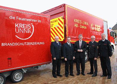 Bildzeile. Landrat Makiolla (M.) und Bezirks- sowie Kreisbrandmeister vor dem neuen Abrollbehälter der Feuerwehr. Foto: C. Rauert