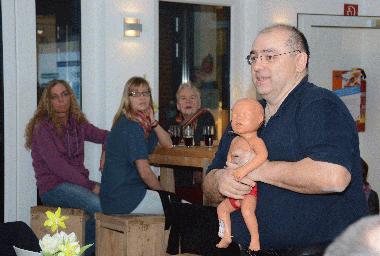 Das Cafe der Familienbande war rappelvoll. Mehr als 40 junge Eltern und einige Großeltern nutzten die Lehrstunde für Fälle, die niemand je erleben möchte. Die Experten aus dem Hellmig-Krankenhaus hatten zwei spezielle Puppen mitgebracht, an denen Eltern Wiederbelebung von Kindern üben konnten. Dr. Erifopoulos stellte klar: "Untätigkeit ist immer falsch. Mit beherzter Hilfeleistung aber können gerade Kinder die Zeit bis zum Eintreffen des Notarztes in vielen Fällen ohne Folgeschäden überstehen."