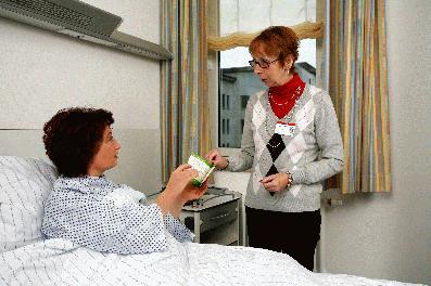 Angela Nowotny leitet den Besuchsdienst und kann sich auf die Unterstützung von 20 Damen und einem Herrn im Alter zwischen 50 und 80 Jahren verlassen. Weitere Mitstreiter werden dringend gesucht, denn die Nachfrage ist groß und das Angebot soll ausgeweitet werden. Bisher treffen sich die Ehrenamtlichen jeweils dienstags morgens um 9 Uhr zu einer kurzen Besprechung, anschließend gehen sie zu den Patienten auf die Stationen. Immer dienstags wird auch die Vorbereitung und Einarbeitung der neuen Helfer erfolgen. Sie werden an ihre Aufgaben herangeführt und intensiv begleitet - und zwar nicht nur in der ersten Phase, sondern auch darüber hinaus. Der Verein Kontakt und Hilfe bietet seinen ehrenamtlichen Helfern regelmäßige Fortbildungen und Supervisionen an - und natürlich den wichtigen Austausch im Team.