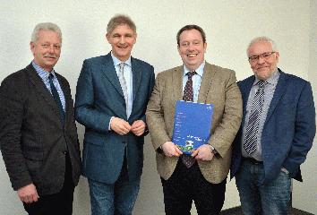 Landrat Makiolla (2. von links), Schulamtsdirektor Peter Rieger (rechts) und Christoph Hermey von der Bezirksregierung Arnsberg (links) hießen Bernd Bruns als neuen Schulaufsichtsbeamten im Kreis Unna willkommen. Foto: B. Kalle - Kreis Unna