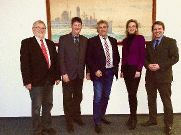 Foto (Stadt Cuxhaven). Gemeinsamer Erfolg: Bernd Jothe (Bündnis 90/ DIE GRÜNEN), Edebohl Tietje (SPD), Oberbürgermeister Dr. Ulrich Getsch, Erste Stadträtin Andrea Pospich und Thiemo Röhler (CDU)