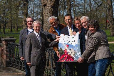 Stellten das Programm des Kleinen Festes 2015 vor: Kurt Radtke (Touristik GmbH Südliches Ostfriesland, v.l.), Landrat Bernhard Bramlage, künstlerischer Festivalleiter Harald Böhlmann, Detlef Oetter (Vorstand der Sparkasse LeerWittmund), Conrad Lübbers (Schloss Evenburg), Signe Foetzki (Ostfriesische Brandkasse) und Birgit Zimmermann, Leiterin des Schloss-Ensembles.
